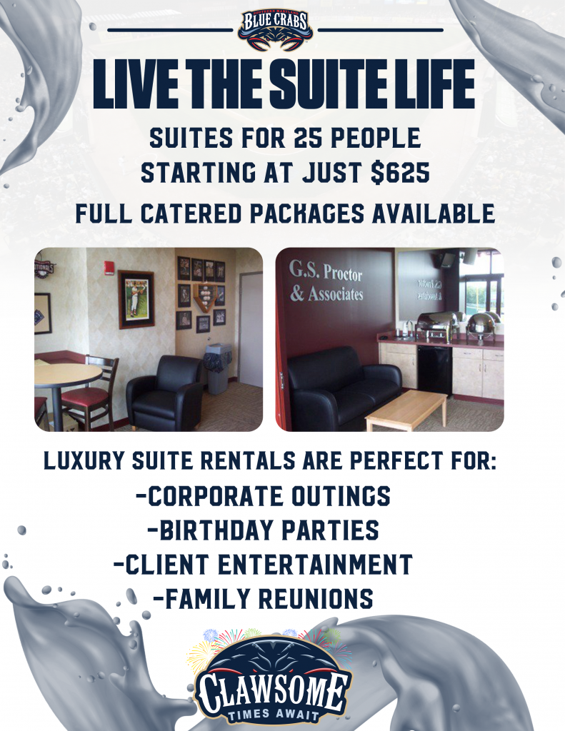 Rent a suite at a Southern Maryland Blue Crabs game and enjoy baseball, unbeatable views, and VIP vibes—all from your own private space. For more information or to book your suite experience, email [email protected] or call (301) 638-9788.